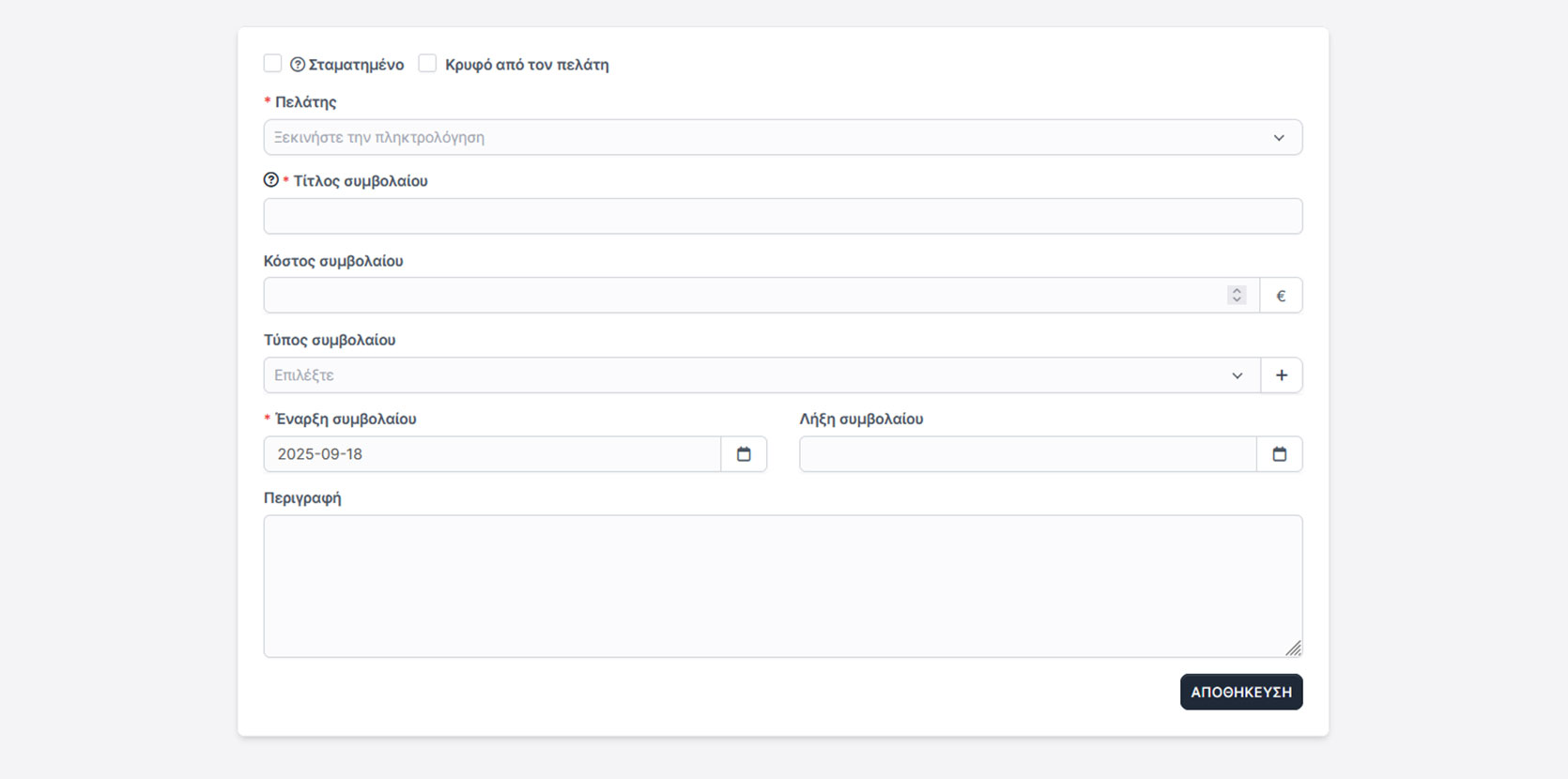 Χρησιμοποιήστε τη λειτουργία συμβολαίων για να διασφαλίσετε τις τρέχουσες και μελλοντικές πωλήσεις. Δημιουργήστε εύκολα ένα PDF συμβολαίου και στείλτε το απευθείας στο email του πελάτη.
