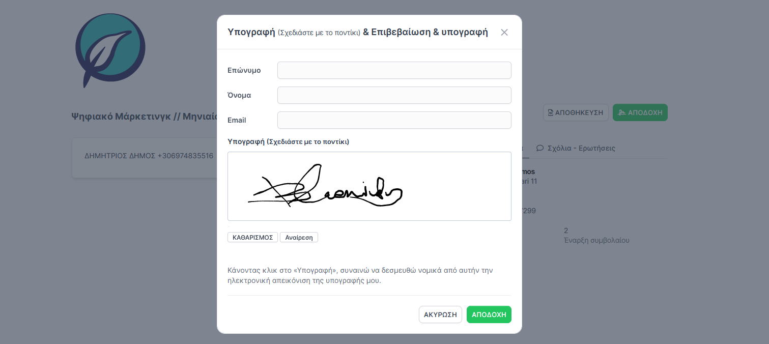Διαθέσιμη επιλογή ηλεκτρονικής υπογραφής για συμβόλαια, προτάσεις και εκτιμήσεις. Αφήστε τους πελάτες σας να υπογράφουν εύκολα αυτά τα έγγραφα και κάντε τη ζωή σας πιο εύκολη.