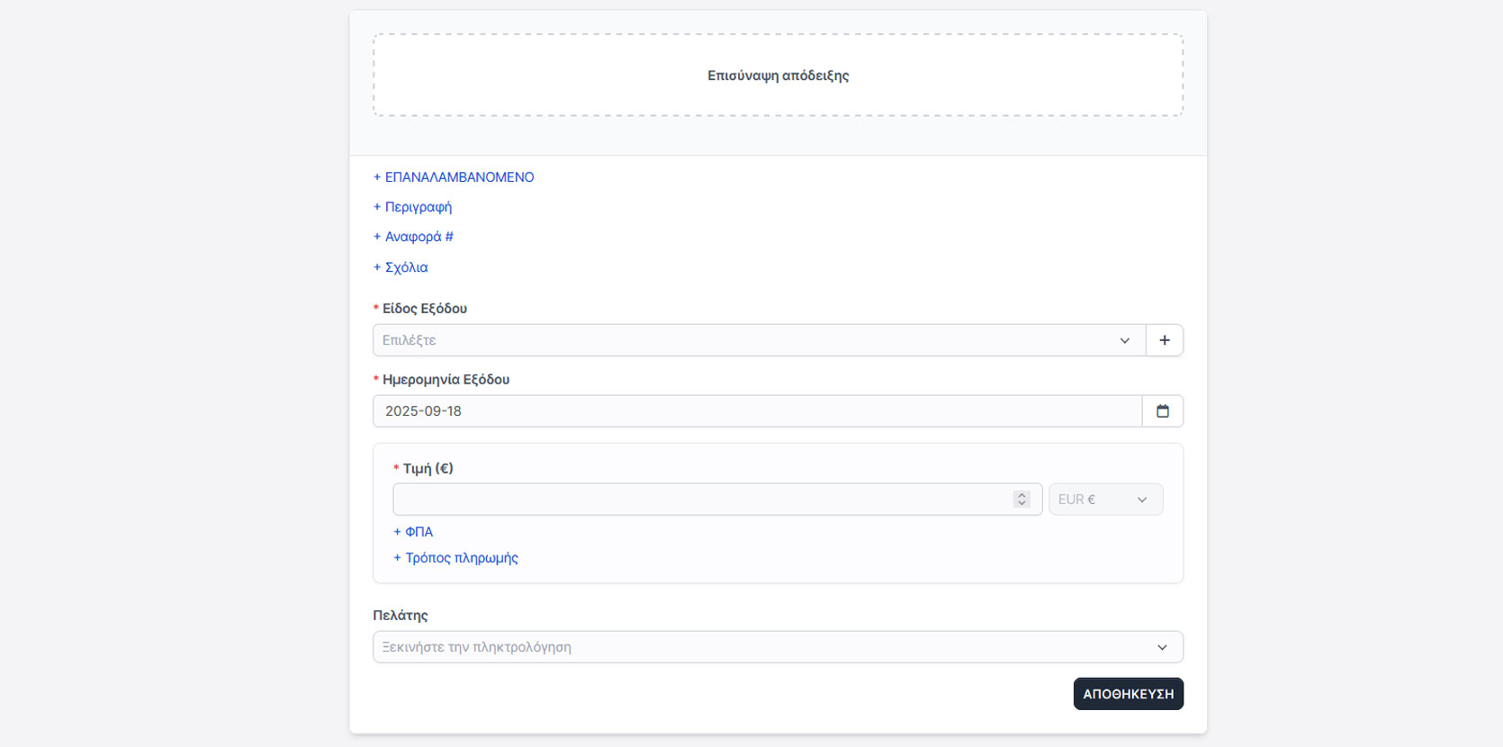 Δημιουργία επαναλαμβανόμενων εξόδων, σε καθορισμένη περίοδο (ημέρες, εβδομάδες, μήνες ή χρόνια). Δυνατότητα ορισμού εξόδων που μπορούν να χρεωθούν σε πελάτες ή σε συγκεκριμένα έργα.
