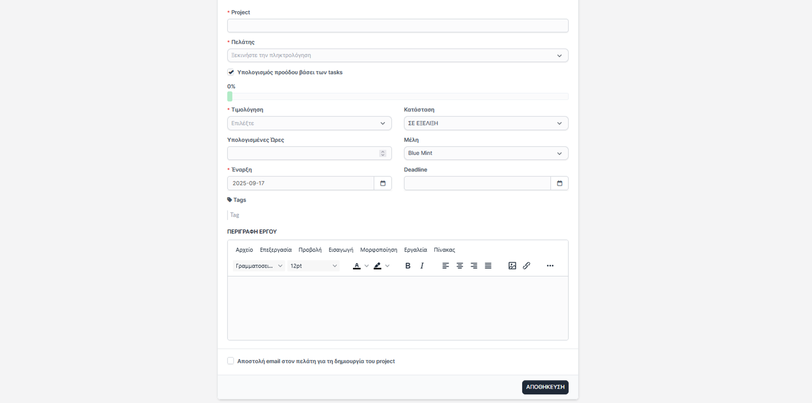 Διαχειριστείτε & τιμολογήστε έργα. Παρακολουθήστε τον χρόνο που αφιερώνεται σε εργασίες & εκδώστε τιμολόγια στους πελάτες σας. Δυνατότητα ανάθεσης πολλών μελών προσωπικού & παρακολούθησης χρονομέτρου για κάθε μέλος ξεχωριστά.